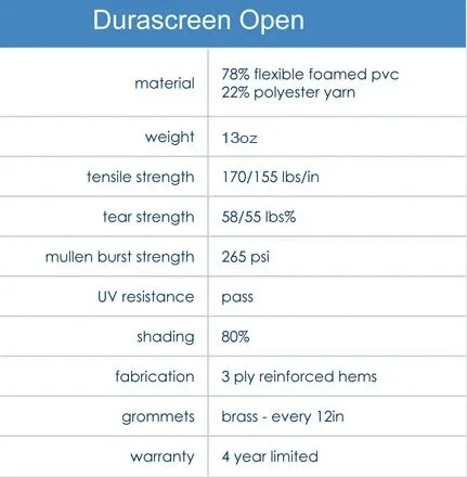 80% shade factor for Durascreen and 93% shade factor for Durascreen Closed